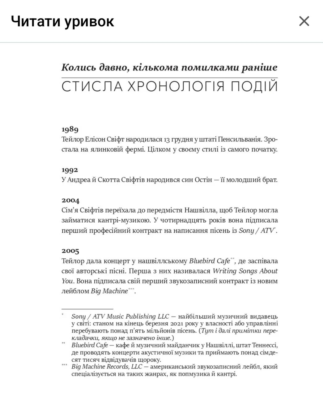Нова книжка – про Тейлор Свіфт. «Стисла хронологія подій». І в тій хронології таке: