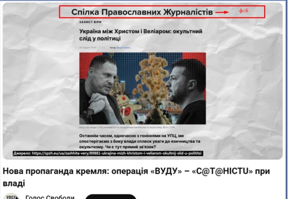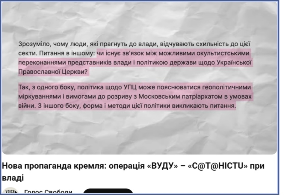 Цитую вам з горе- статті: “питання в іншому. Чи існує зв'язок між можливими окультистськими переконаннями представників влади і політикою держави щодо Української православної церкви? Так, з одного боку, політика щодо УПЦ може пояснюватися геополітичними міркуваннями і вимогами до розриву з Московським патріархатом в умовах війни. З іншого боку, форма і методи цієї політики викликають питання”