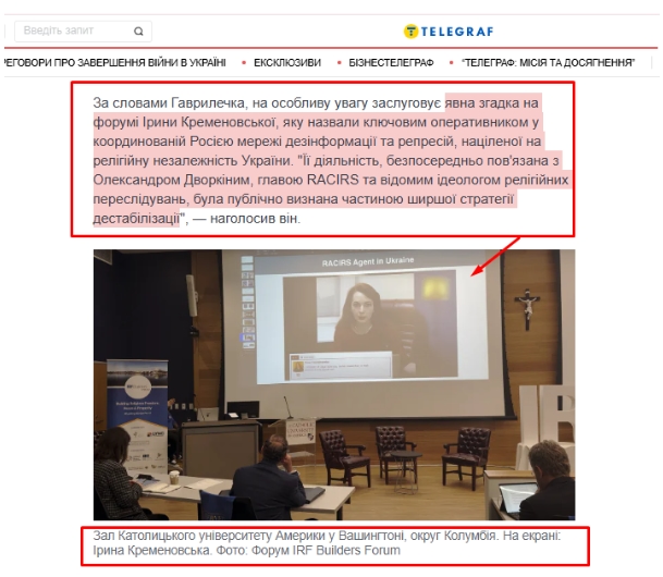 За такі її "заслуги" та зв'язки з РАЦИРС її особливо згадали на міжнародному форумі IRF Builders у Вашингтоні - Civil Society Congress. Тобто Ірину Кременовськуї, назвали ключовим оперативником у координованій росією мережі дезінформації та репресій, націленої на релігійну незалежність України. "Її діяльність, безпосередньо пов'язана з Олександром Дворкіним, главою РАЦИРС та відомим ідеологом релігійних переслідувань, була публічно визнана частиною ширшої стратегії дестабілізації