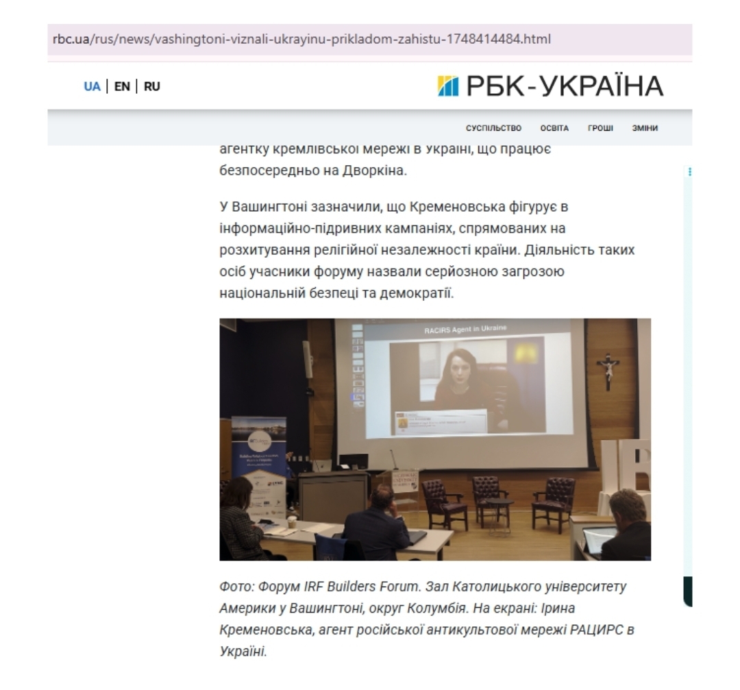 Кременовську називають агенткою РАЦИРС, структури, яку у Вашингтоні офіційно охарактеризували як інструмент гібридної війни рашки. Під виглядом «фахівчині» вона просуває в Україні російські наративи та риторику, вигідну РПЦ і російській пропаганді.