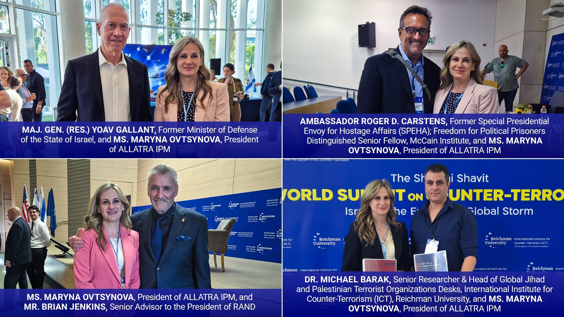 Генерал-майор (у відставці) Йоав Галлант, колишній міністр оборони Держави Ізраїль; Посол Роджер Д. Карстенс, колишній спеціальний посланник президента з питань заручників (SPEHA), почесний старший науковий співробітник Інституту Маккейна з питань звільнення політичних в'язнів; Брайан Дженкінс, старший радник президента RAND; доктор Майкл Барак, старший науковий співробітник і керівник відділу глобального джихаду та палестинських терористичних організацій Міжнародного інституту боротьби з тероризмом (ICT) Університету Райхмана; пані Марина Овцинова, президент ALLATRA IPM на Всесвітньому саміті Шабтая Шавіта з питань боротьби з тероризмом.