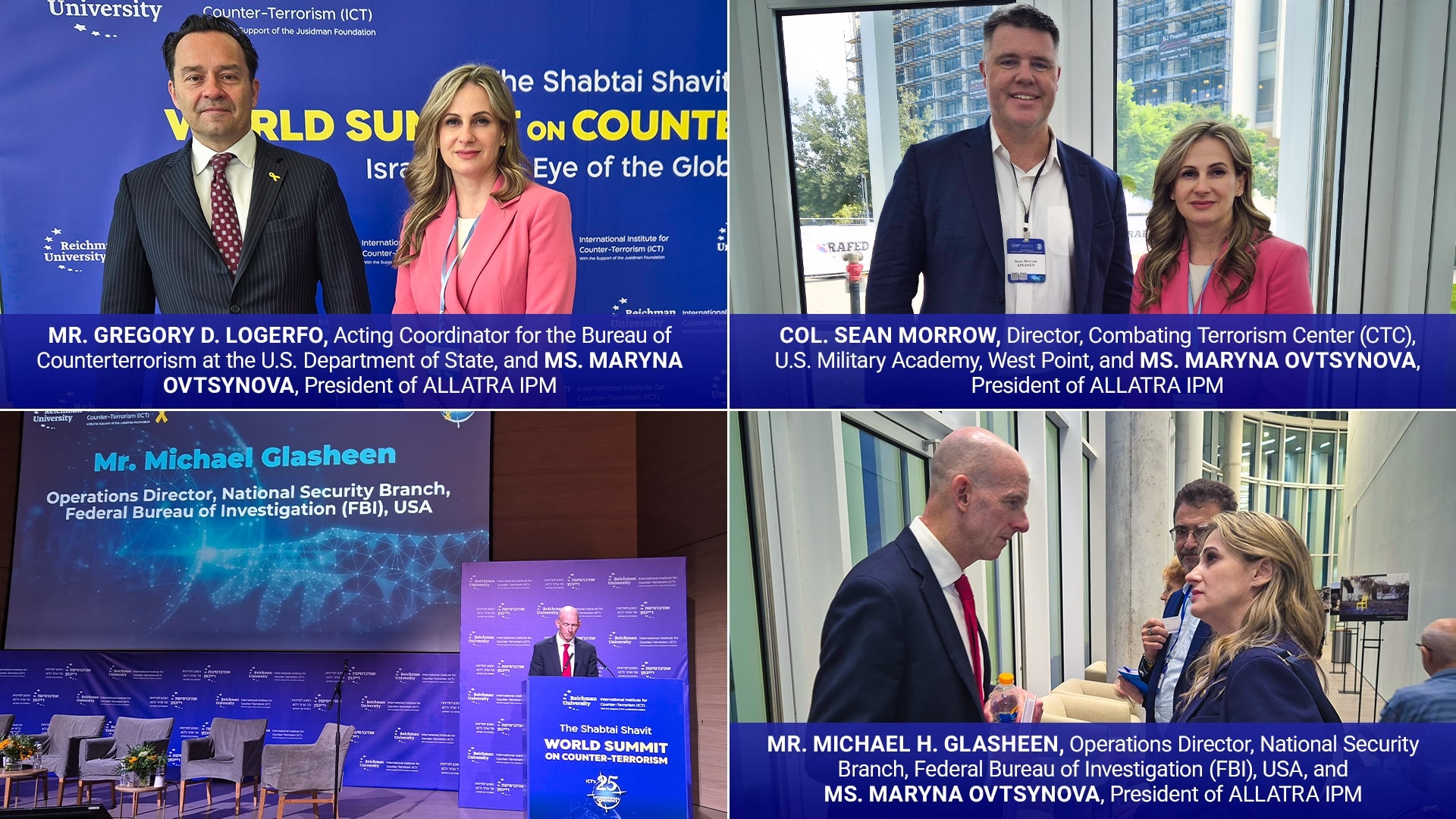Грегорі Д. ЛоГерфо, виконуючий обов'язки координатора Бюро з протидії тероризму Державного департаменту США; Полковник Шон Морроу, директор Центру боротьби з тероризмом (CTC) Військової академії США у Вест-Пойнті; Майкл Г. Глашин, оперативний директор Відділу національної безпеки Федерального бюро розслідувань (ФБР) США; Пані Марина Овцинова, президент ALLATRA IPM на Всесвітньому саміті Шабтая Шавіта з протидії тероризму