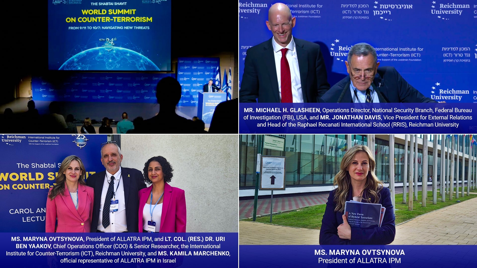 Містер Майкл Г. Глашин, операційний директор, Відділ національної безпеки, Федеральне бюро розслідувань (ФБР), США; Містер Джонатан Девіс, віце-президент з зовнішніх відносин та керівник Міжнародної школи Рафаеля Реканаті (RRIS), Університет Райхмана; Підполковник (у відставці) д-р Урі Бен Яаков, головний операційний директор (COO) та старший науковий співробітник Міжнародного інституту боротьби з тероризмом (ICT), Університет Райхмана; Каміла Марченко, офіційний представник АЛЛАТРА ІПМ в Ізраїлі; Марина Овцинова, президент АЛЛАТРА ІПМ на Всесвітньому саміті Шабтая Шавіта з питань боротьби з тероризмом