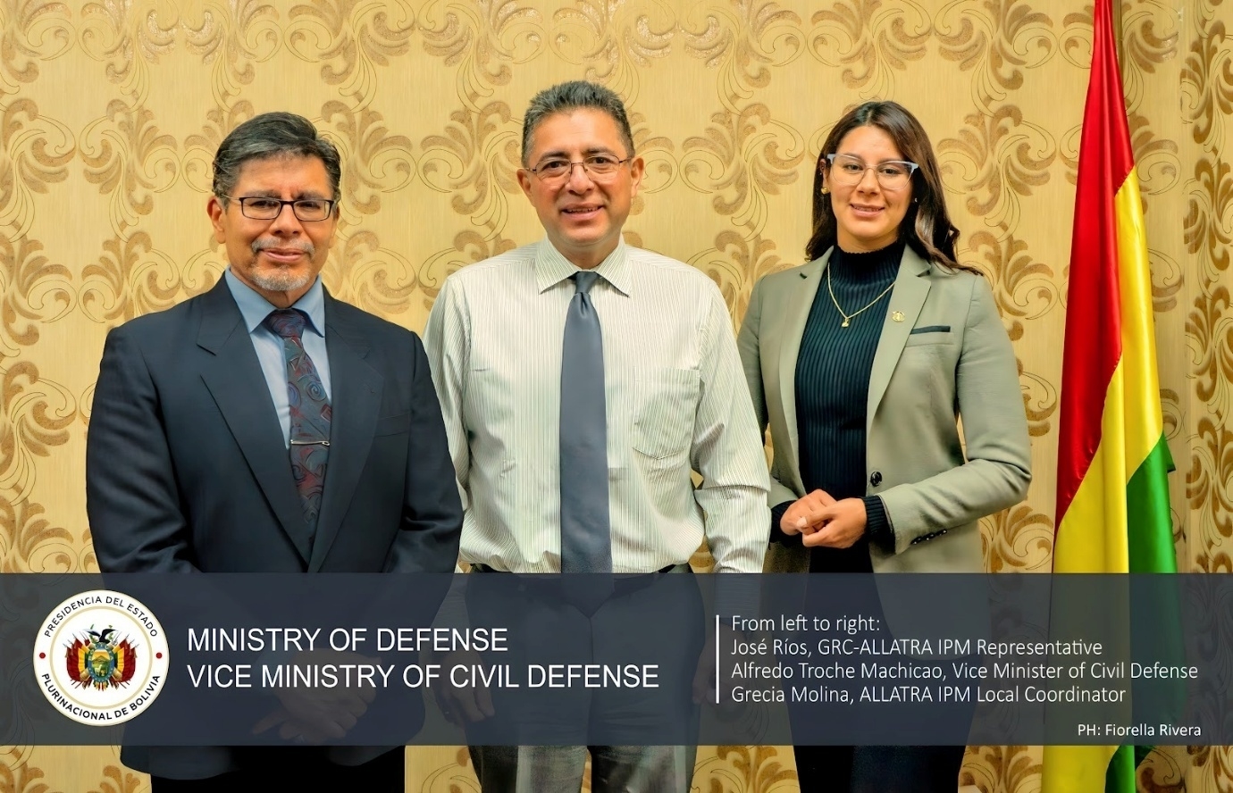 Хосе Ріос, представник АЛЛАТРА в Латинській Америці; Альфредо Троче Мачікао, заступник міністра цивільної оборони Болівії; та Гресіа Паола Моліна, місцевий координатор АЛЛАТРА
