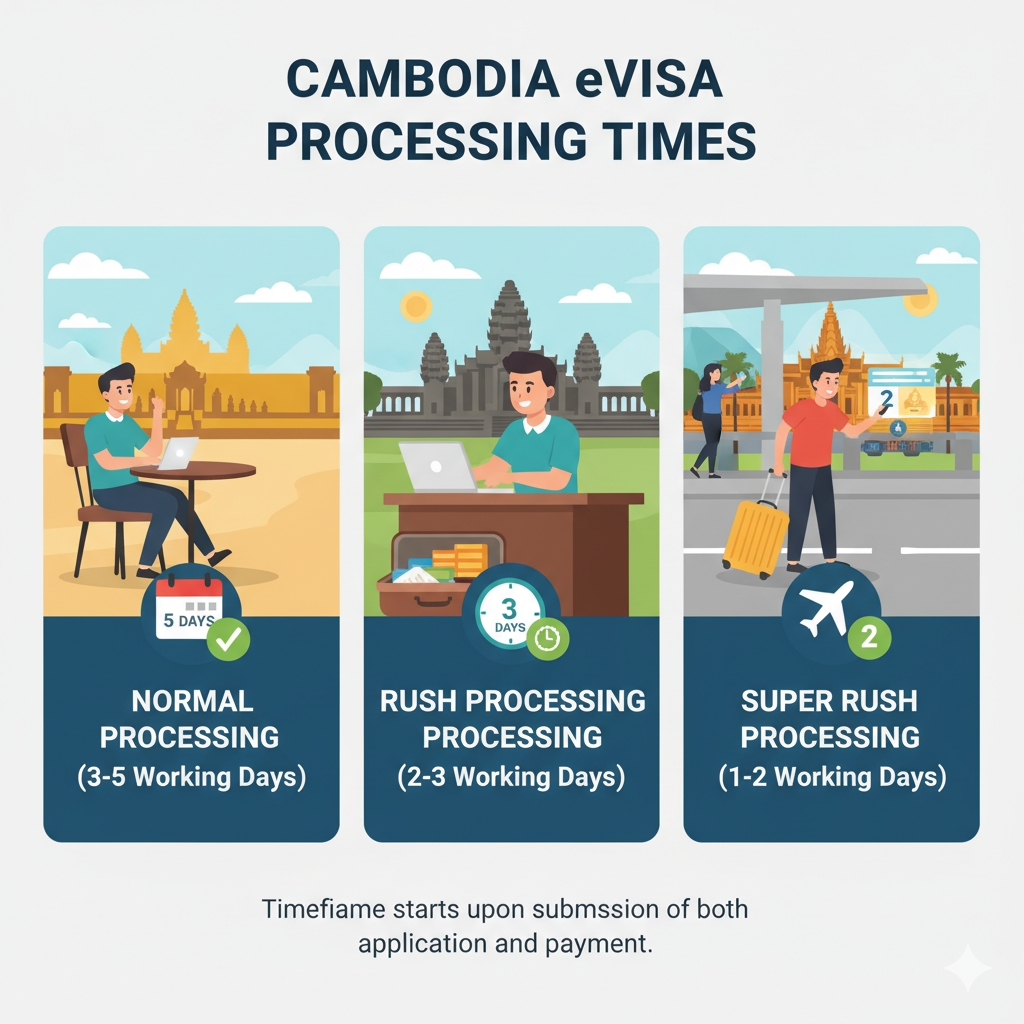 The Cambodia electronic visa is available for processing at different times according to the emergency situation of the visa applicant.