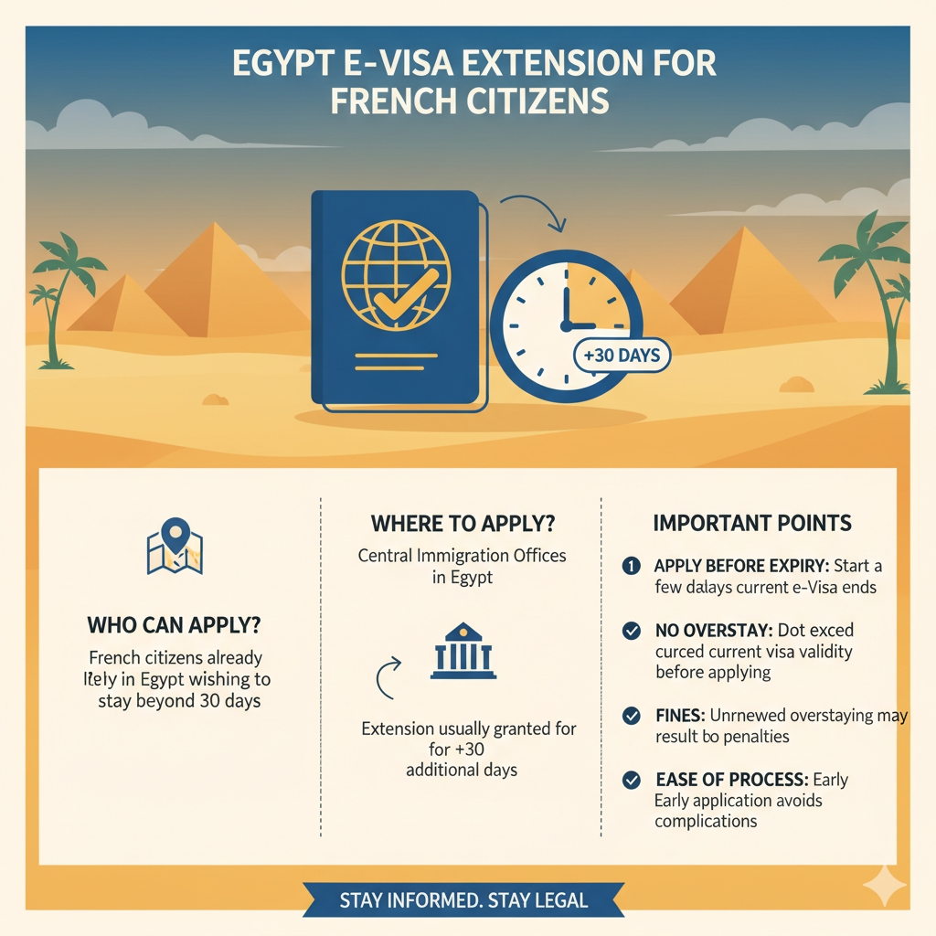In case French citizens want to remain in Egypt after the period of 30 days, they may seek an e-visa extension or renewal in Egypt itself. This is possible in the central immigration offices.