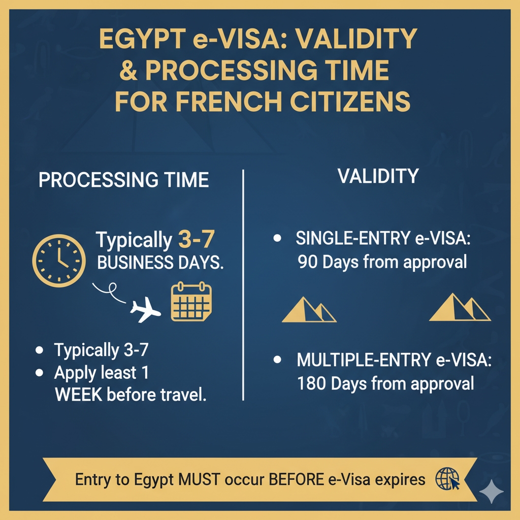 Based on the official rules, the processing time of an Egyptian e-Visa application for French citizens is usually 3 to 7 business days once the application is properly submitted. Nevertheless, it is better to send the application at least a week before the flight to avoid any unforeseen delays.