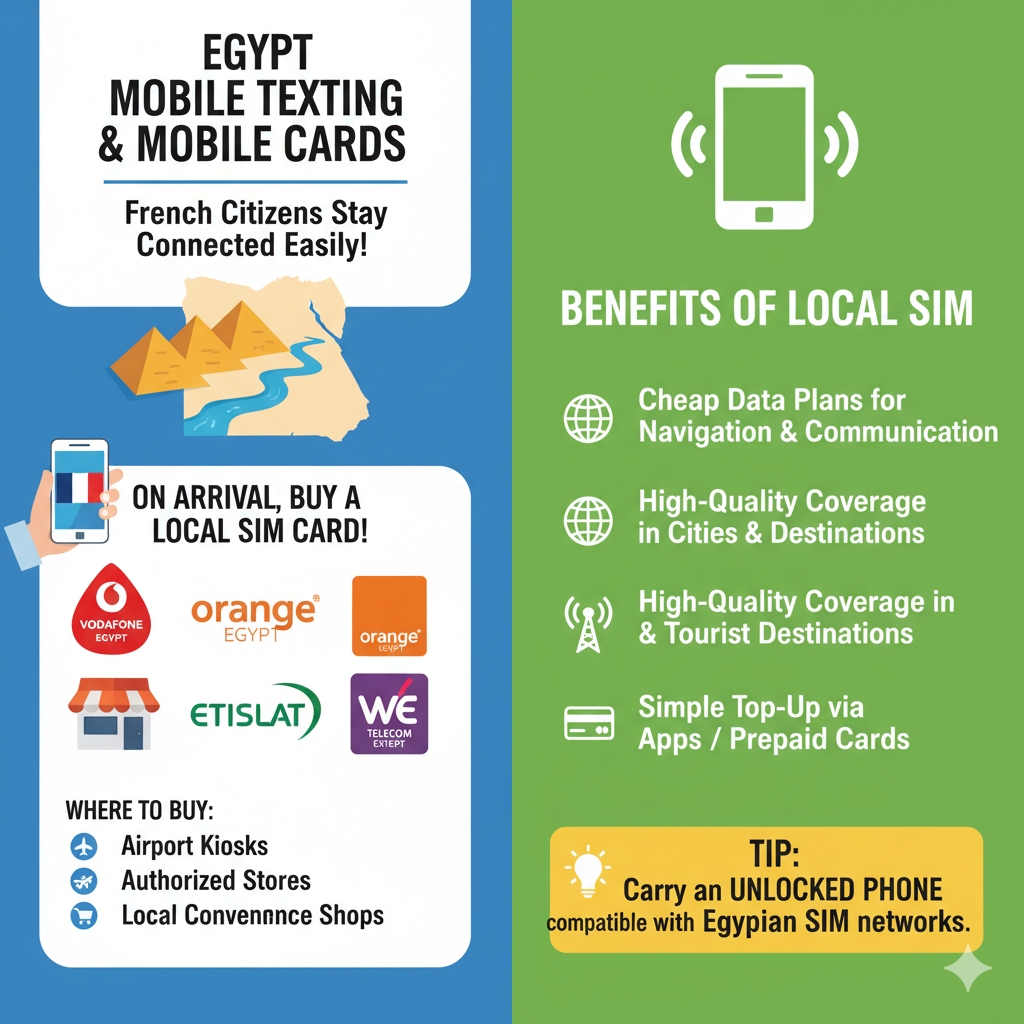 The French citizens find it easy to remain in touch in Egypt. On arrival, tourists will be able to buy local SIM cards with the major telecom providers, which include: