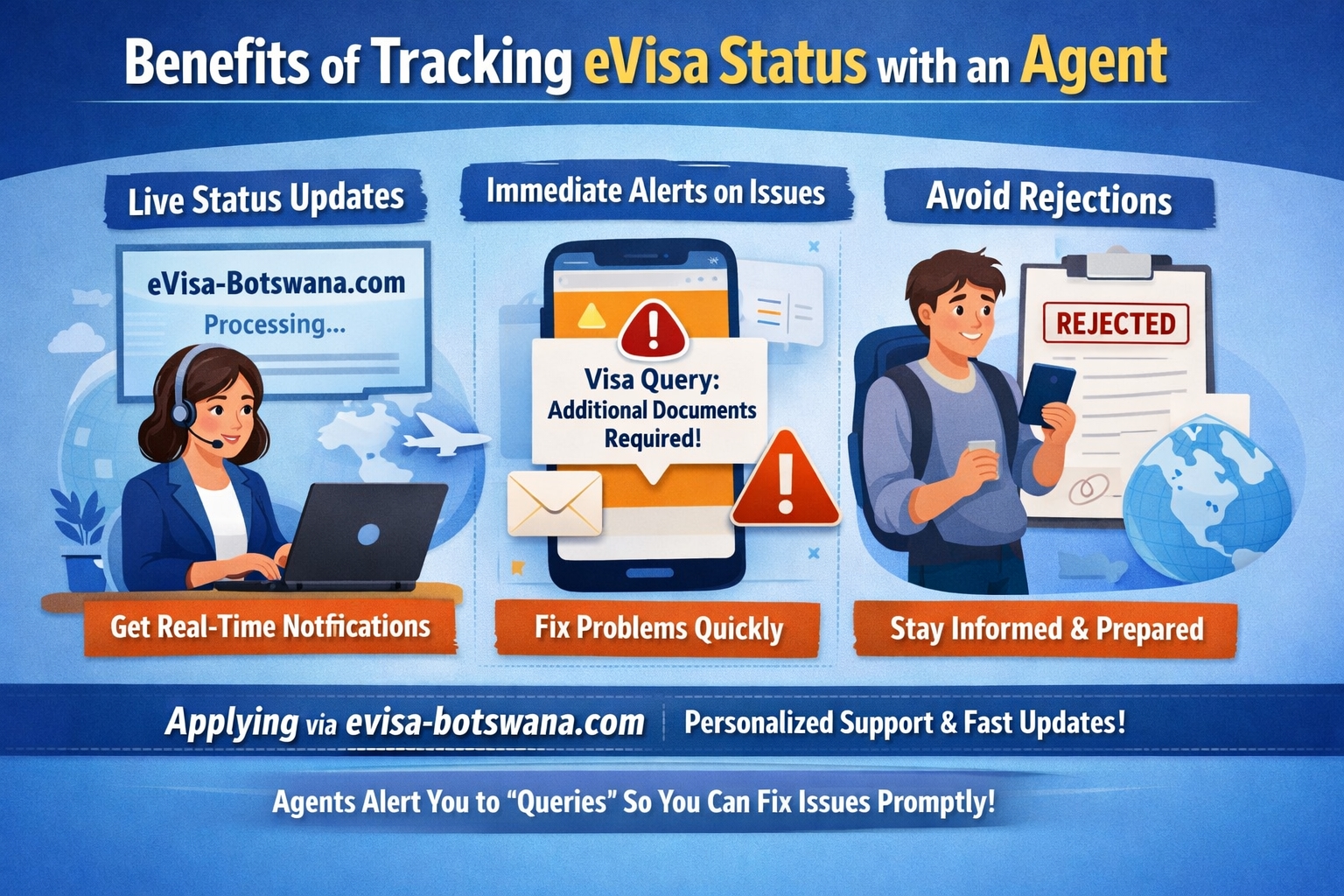 When you apply through evisa-botswana.com, you aren't left in the dark. Unlike official portals that can sometimes be slow to update, an agent provides personalized notifications. If there is a "query" from immigration, the agent alerts you immediately so you can fix it before it leads to a rejection.