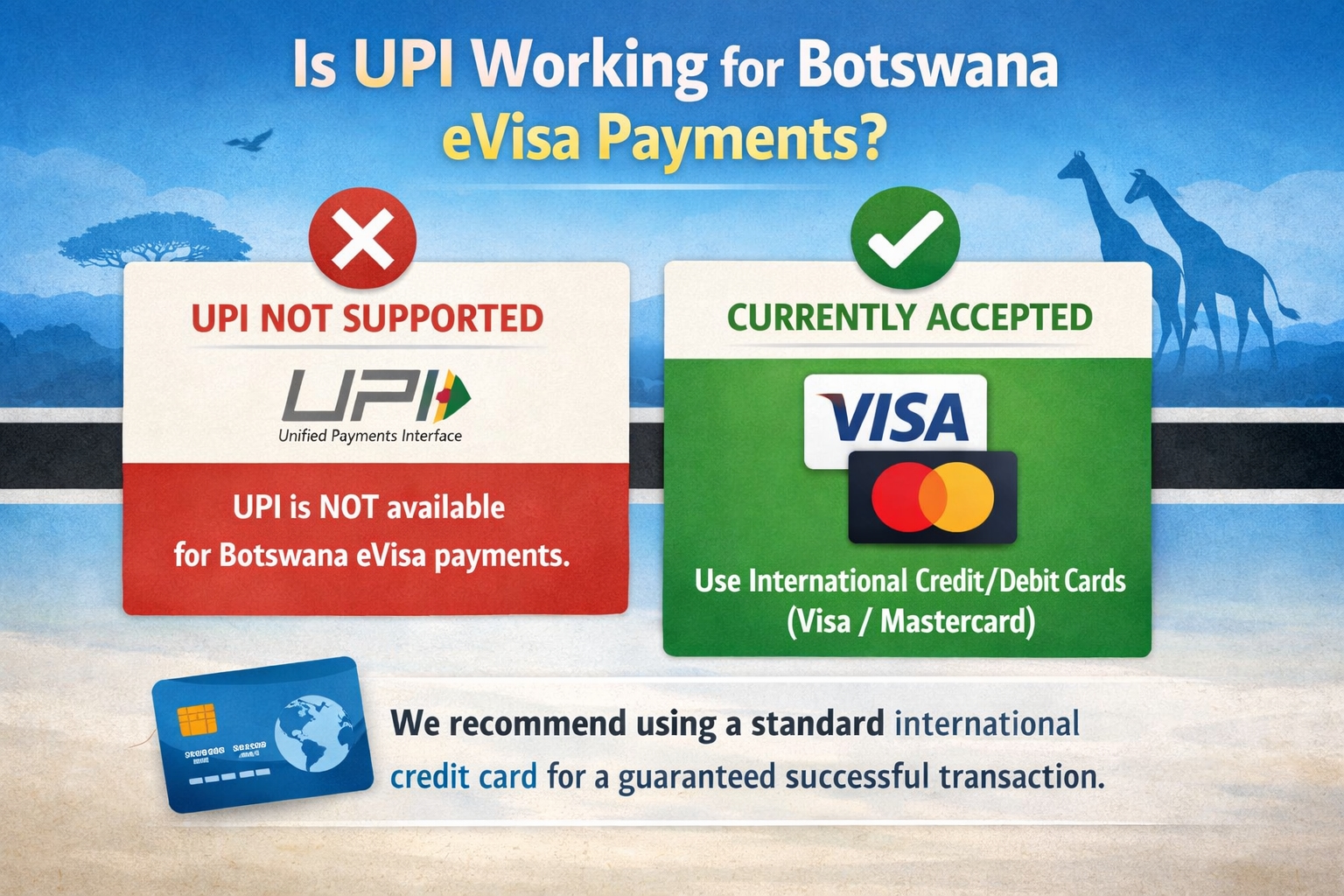 Currently, the primary payment methods are international Credit/Debit cards (Visa/Mastercard). While UPI is expanding globally, it is not yet a standard payment gateway for Botswana eVisas. We recommend using a standard international credit card for a guaranteed successful transaction.
