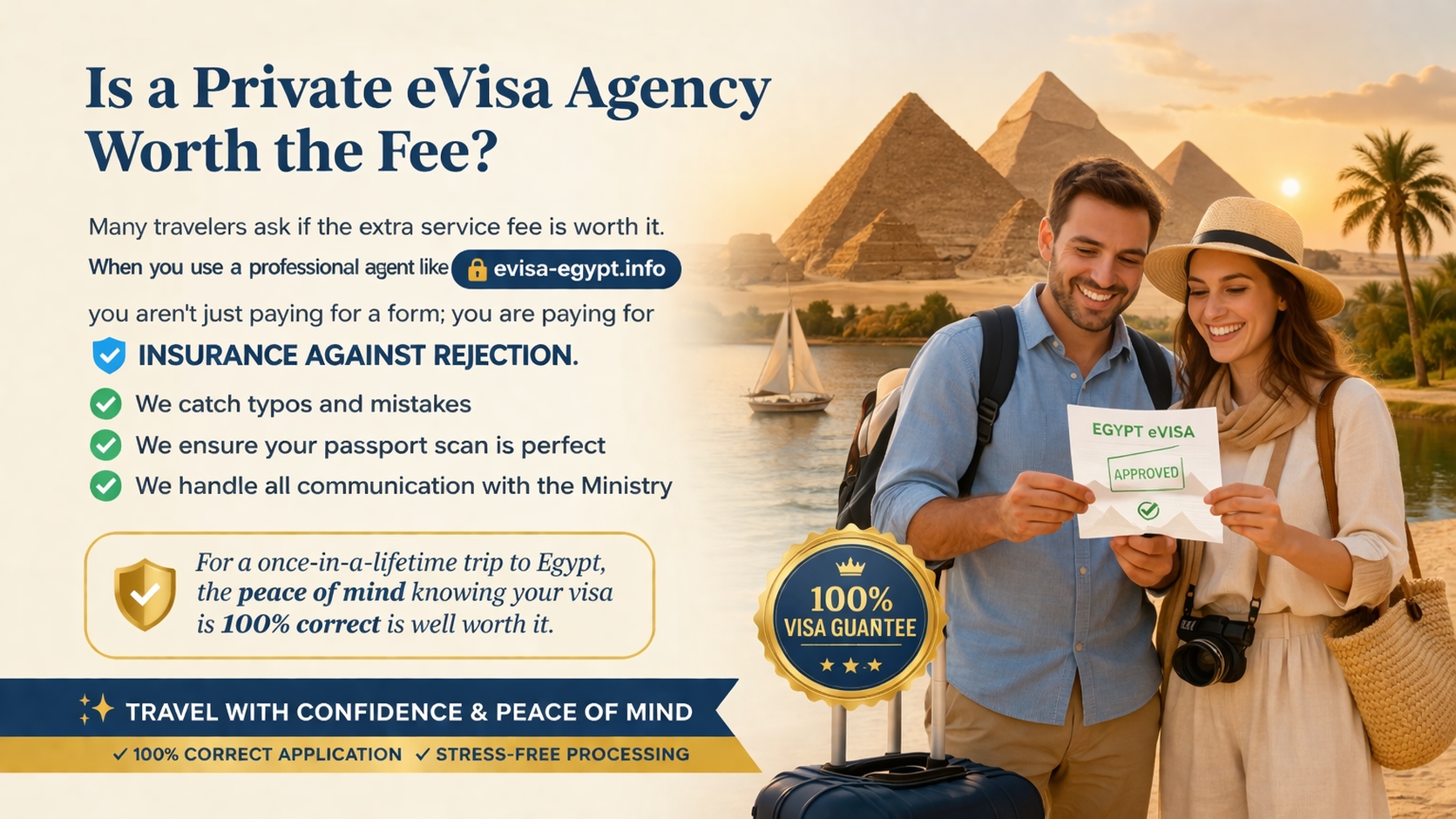 Many travelers ask if the extra service fee is worth it. When you use a professional agent like evisa-egypt.info, you aren't just paying for a form; you are paying for insurance against rejection. We catch typos, ensure your passport scan is legible, and handle the communication with the Ministry. For a once-in-a-lifetime trip to Egypt, the peace of mind knowing your visa is 100% correct is well worth the investment.
