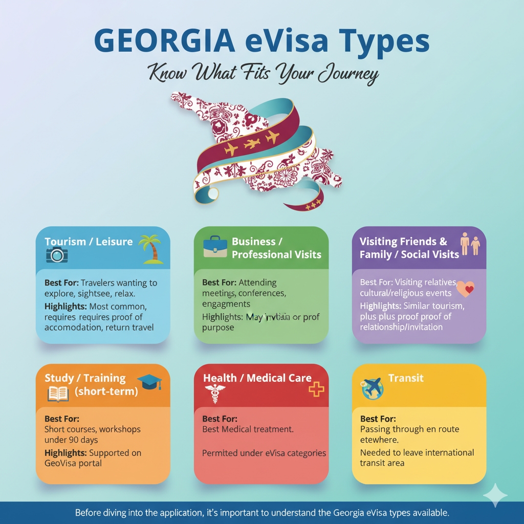 Before diving into the application, it’s important to understand the Georgia eVisa types available. Each type serves a specific purpose, so knowing which one suits your travel plans ensures a smoother approval process.