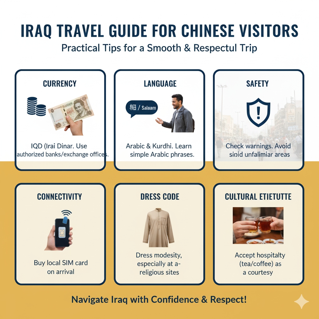 Iraq is a very interesting combination of ancient tradition, cultural hospitality and rebuilding. The following are useful suggestions on how to have a smooth trip: