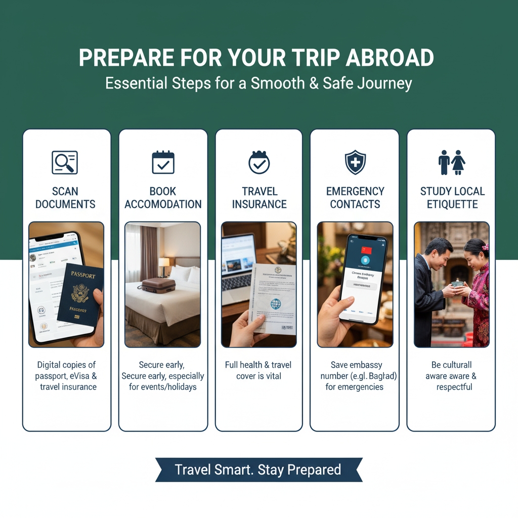 Scan All Documents- Have digital copies of your passport, eVisa and travel insurance.