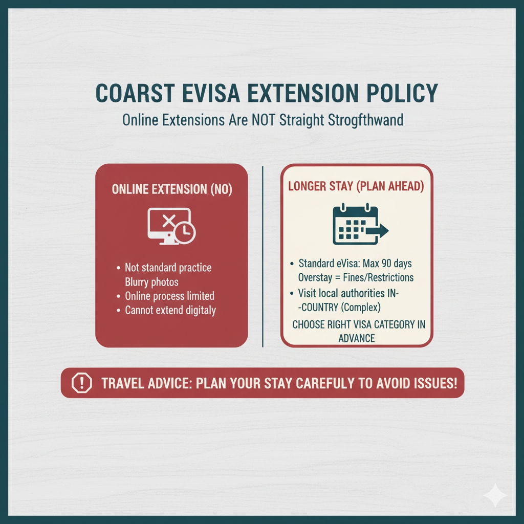 Extension possibilities are limited. The standard eVisa allows entry within its validity and stay up to the specified period (often up to 90 days). Sources suggest extension after arrival is not straightforward and may involve visiting local authorities in Ivory Coast, which can be tricky. If you think you might need a longer stay, you should plan ahead — perhaps choose the right category and ensure you don’t overstay. Overstaying can lead to fines or future entry restrictions.