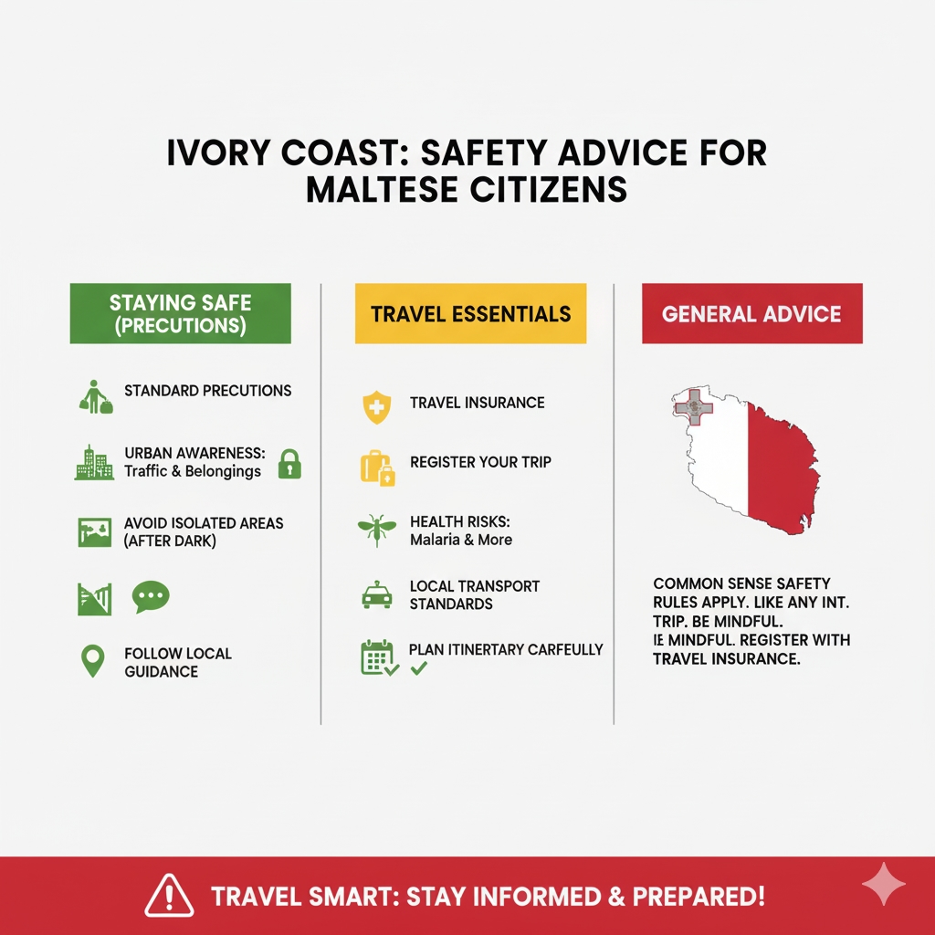 Yes — this one is very important. All travellers entering Ivory Coast are required to present a valid yellow fever vaccination certificate (often called the “yellow card”). It must be administered at least 10 days before travel (as per WHO guidelines) in many cases. Without this, you may be refused entry. From Malta, ensure you’ve booked and taken this vaccination well before departure.
