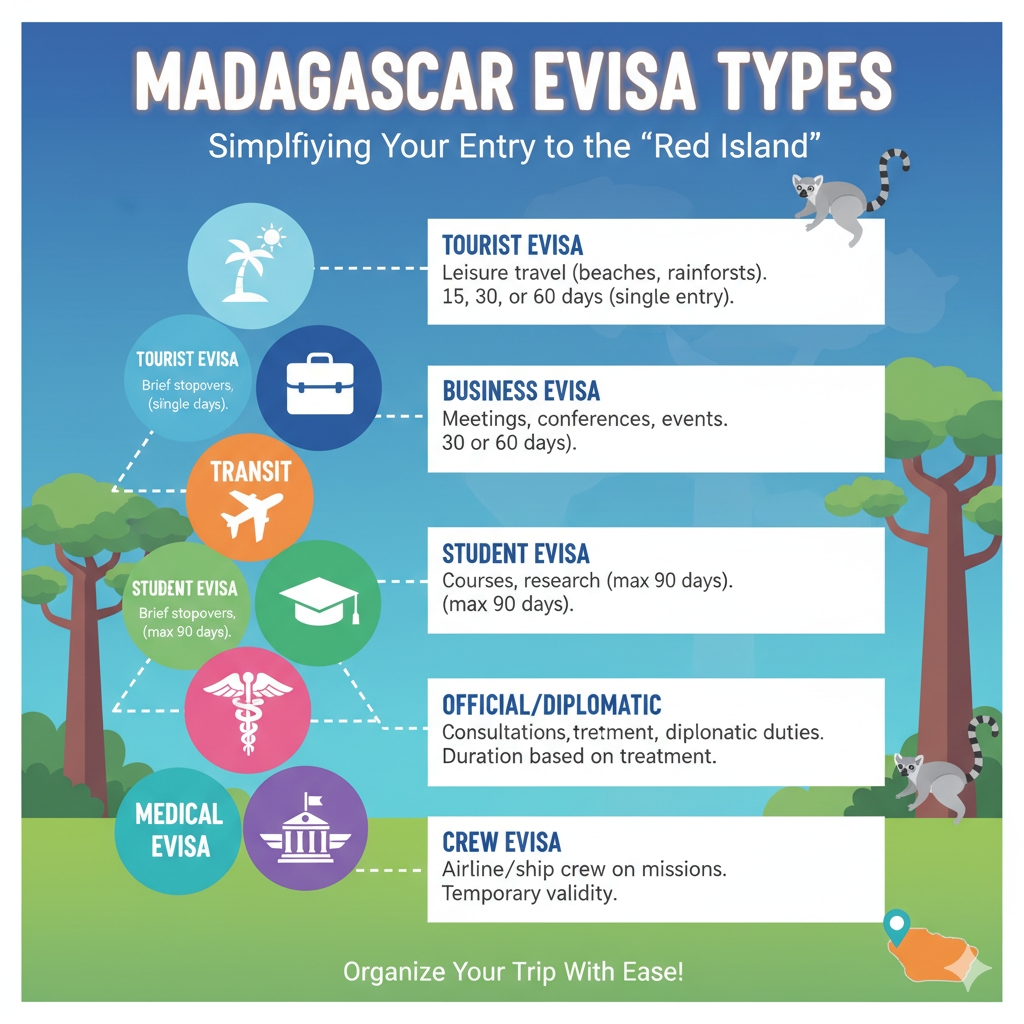 Tourist eVisa: Best for leisure visitors traveling to Madagascar's beaches, rainforests, and cultural attractions. Valid for 15, 30, or 60 days (single entry).