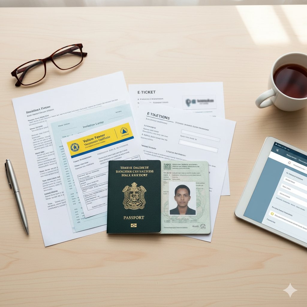 Beyond the visa approval letter, have your flight reservation, accommodation booking, travel insurance (recommended), proof of funds, yellow-fever vaccination certificate (if needed) ready. Immigration officers may ask.