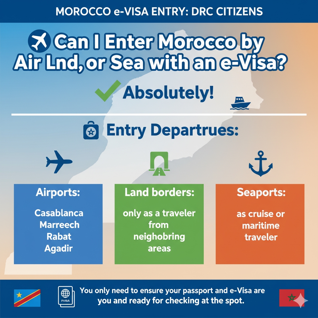 Provided that the access point in Morocco is an e-Visa-capable one, a DRC citizen is allowed to enter Morocco via a major airport, a land checkpoint, or a seaport.