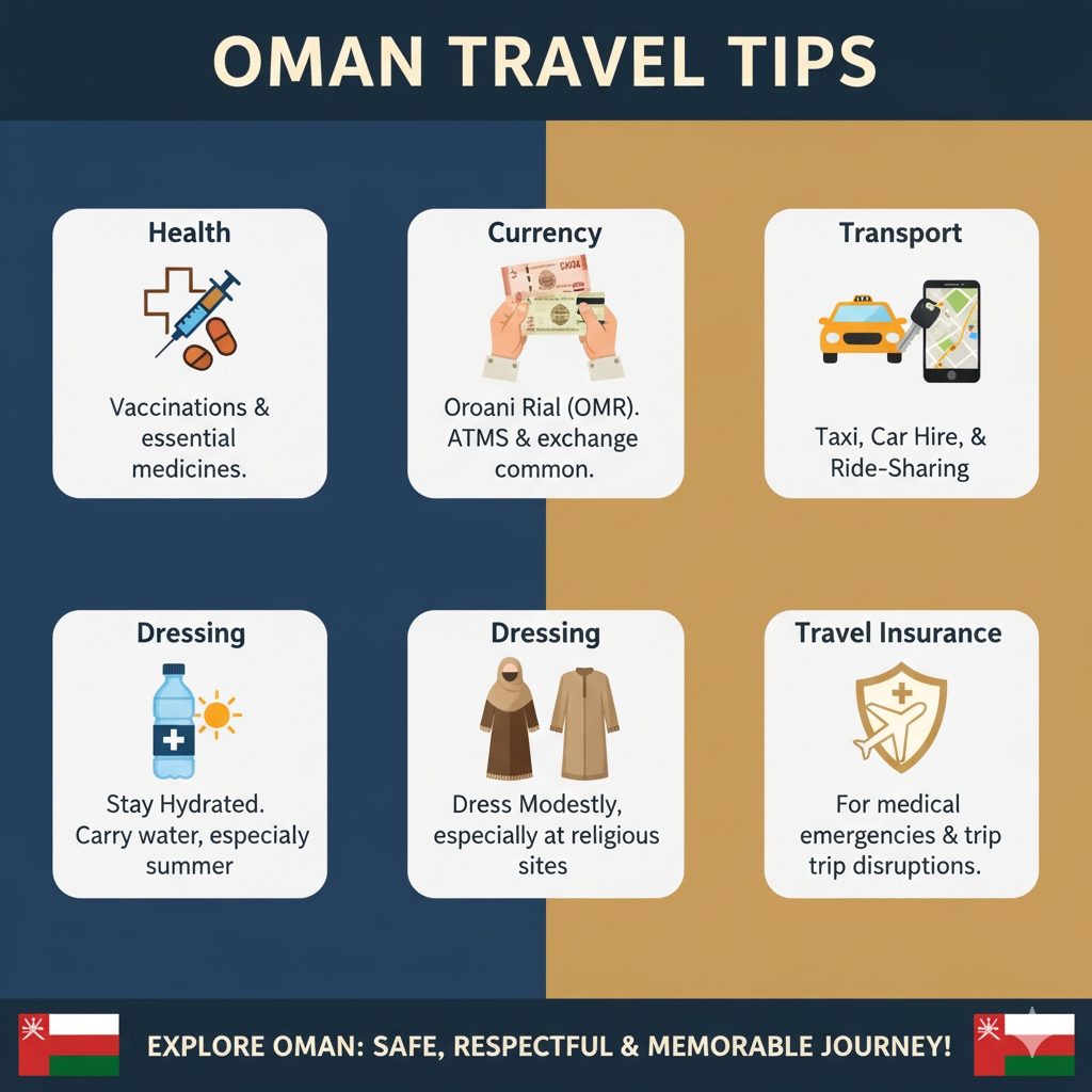 Currency: The local currency is called Omani Rial (OMR); ATMs and currency exchange are very common.