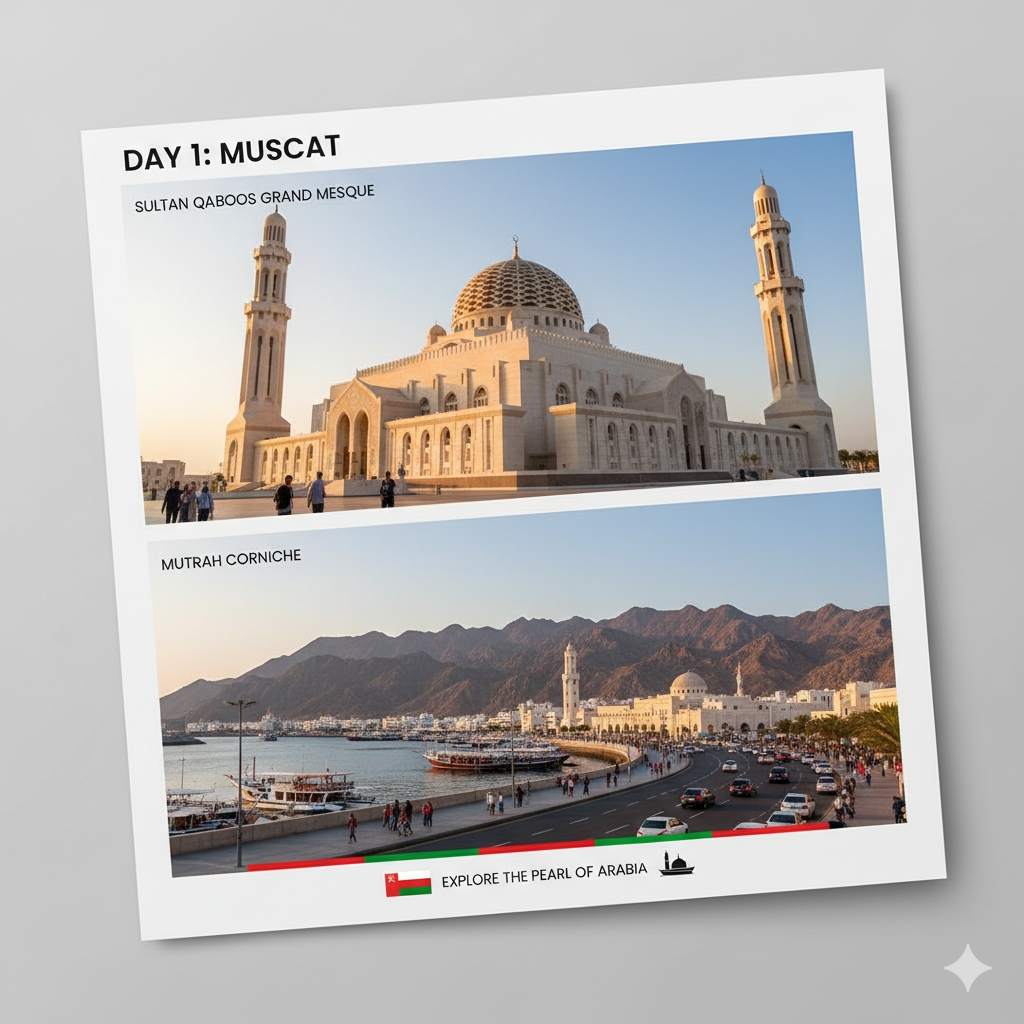 Muscat: Sultan Qaboos Grand Mosque, Mutrah Corniche.