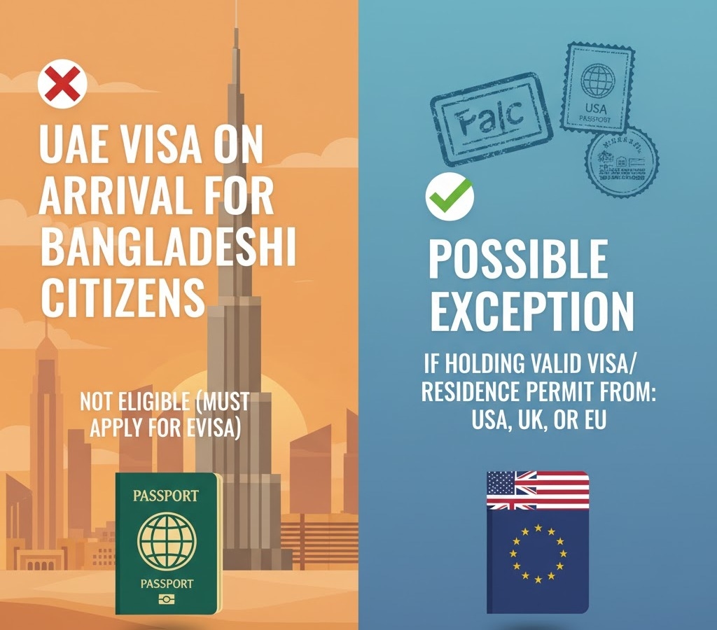 Currently, Bangladeshi passport holders are not eligible for a visa on arrival. You must apply for the UAE eVisa before traveling.