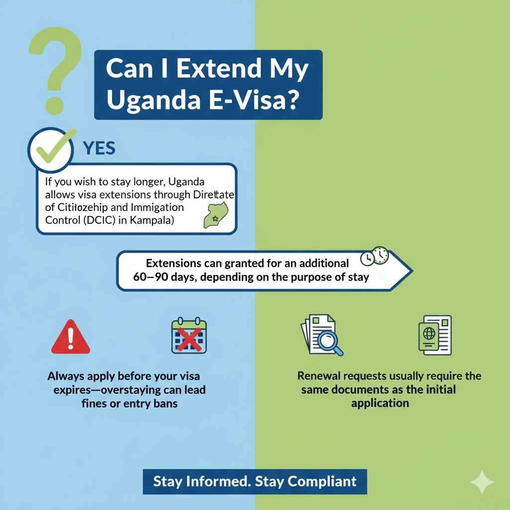 Yes. If you wish to stay longer, Uganda allows visa extensions through the Directorate of Citizenship and Immigration Control (DCIC) in Kampala.