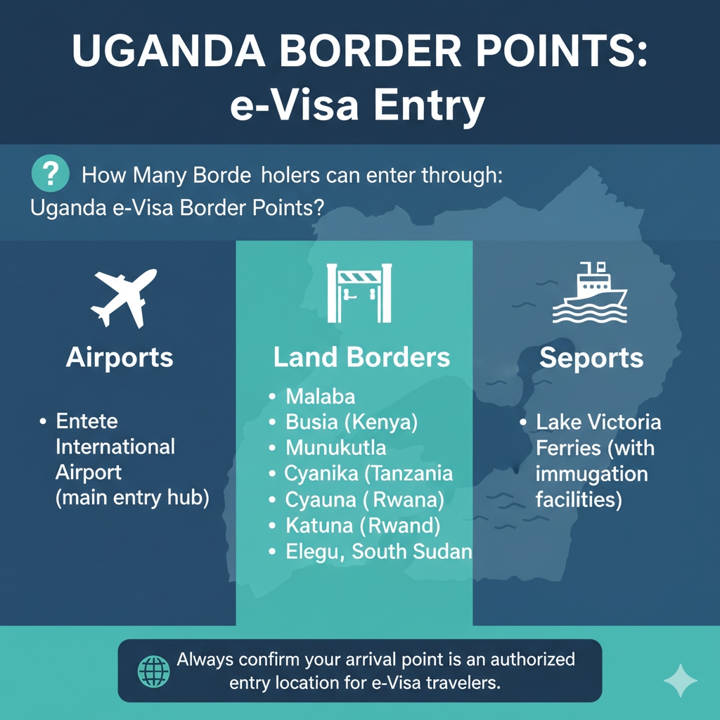 Uganda e-Visa holders can enter the country through several international airports and land borders.