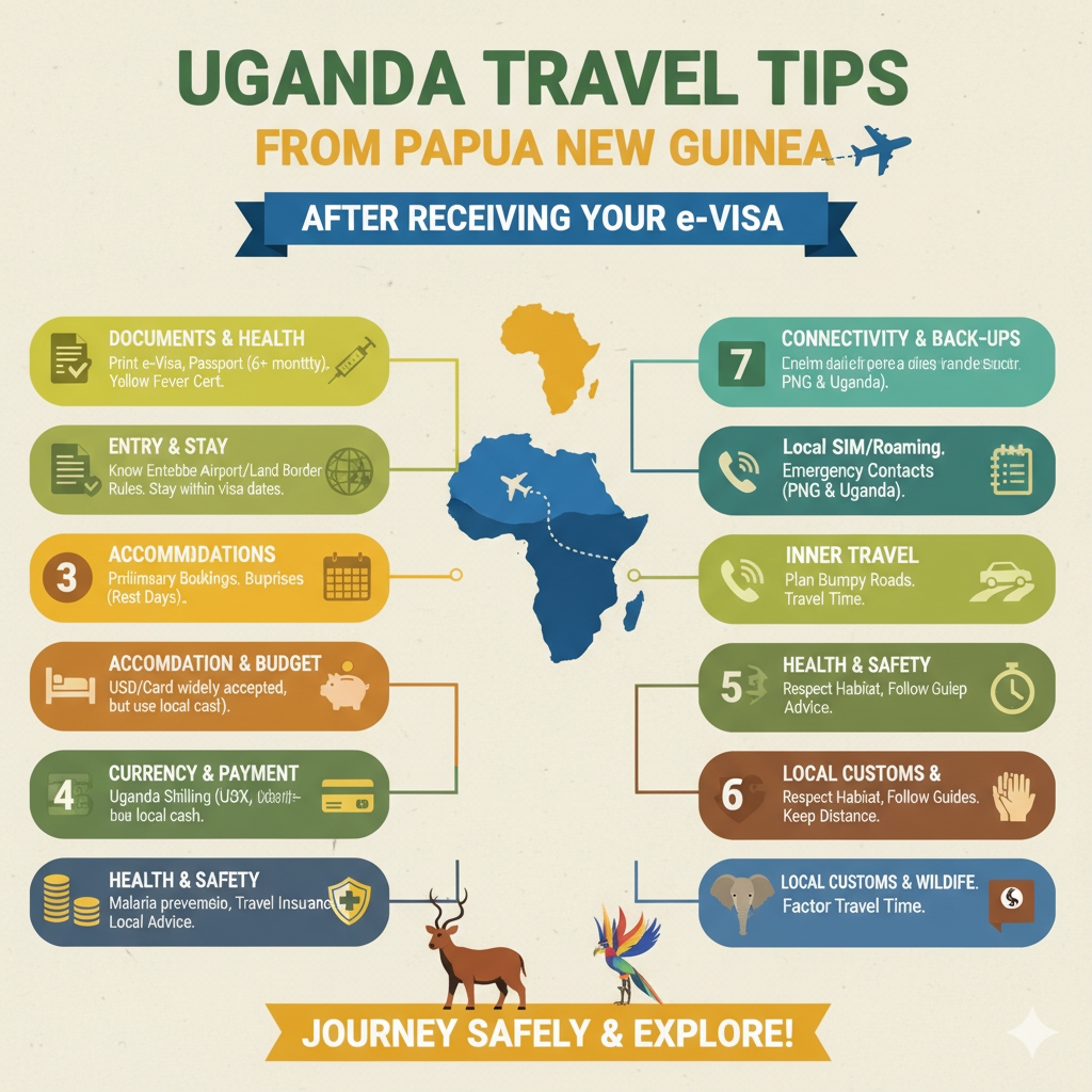 For PNG travellers: communicate with your travel agent or service provider in Uganda early, check local regulations, and keep all receipts/documentation.