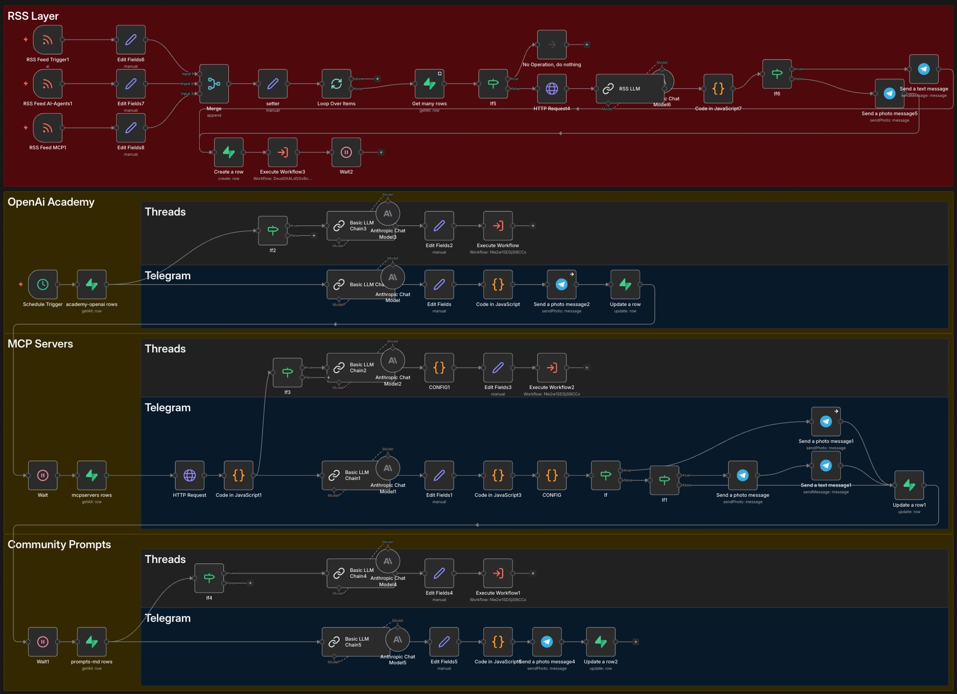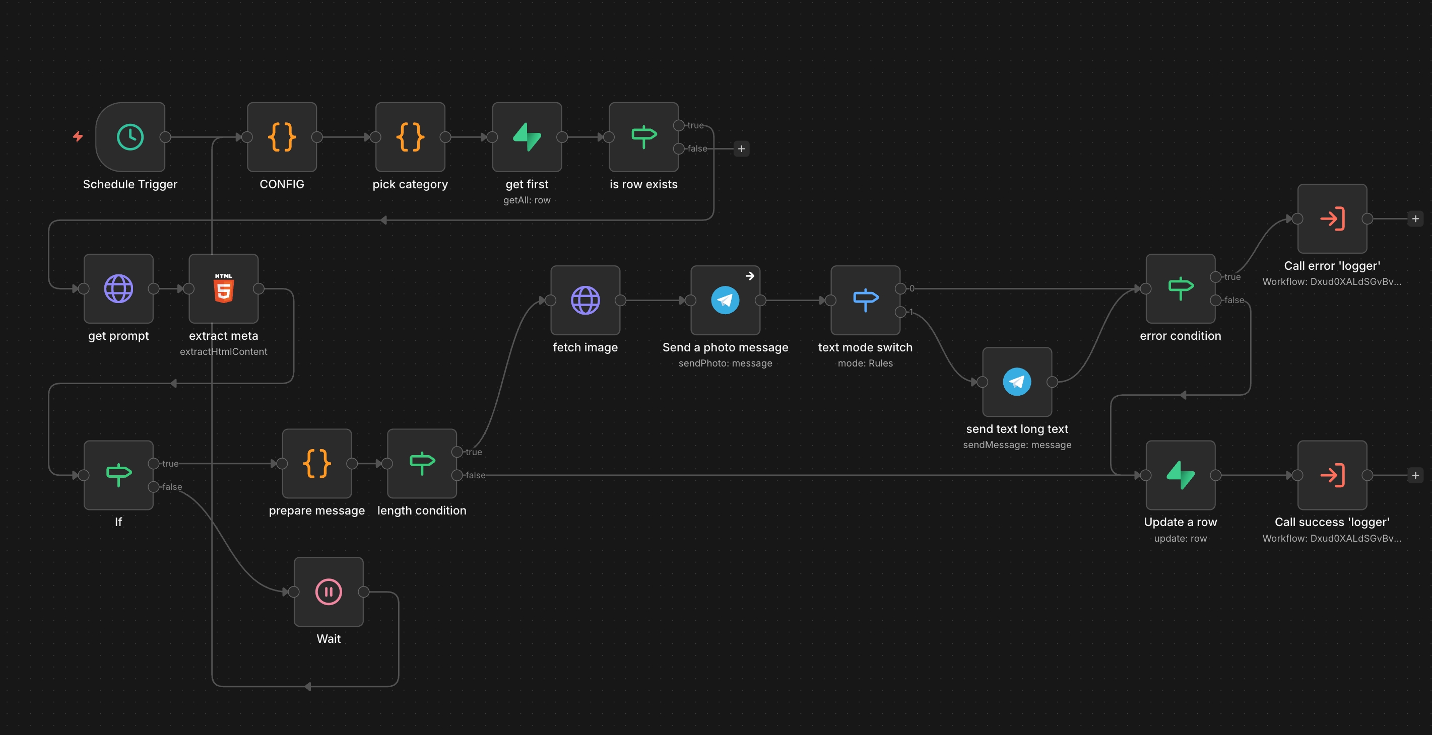 Тут публікуються промпти для генерації зображень у різних моделях, схема доволі проста (Запуск, отримання даних, переівірка, постинг, логування, очікування, і все спочатку). Доречі це єдиний канал який не використовує LLM.