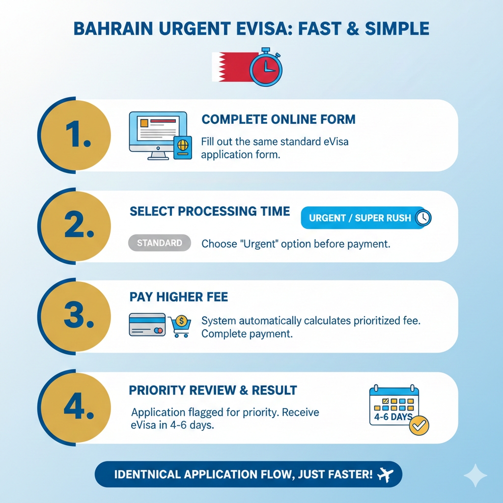 Applying for a Bahrain Urgent eVisa is really easy because it uses the exact same online form and document checklist as the standard application.