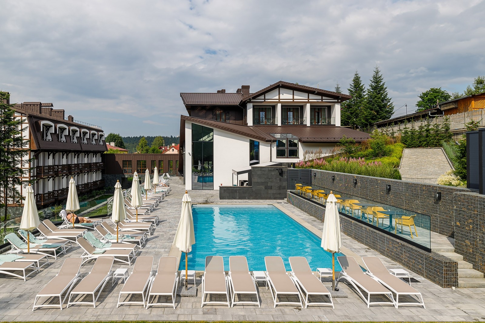 Басейн комплексу створено так, щоб поєднати природну гармонію Карпат із комфортом сучасного готелю.