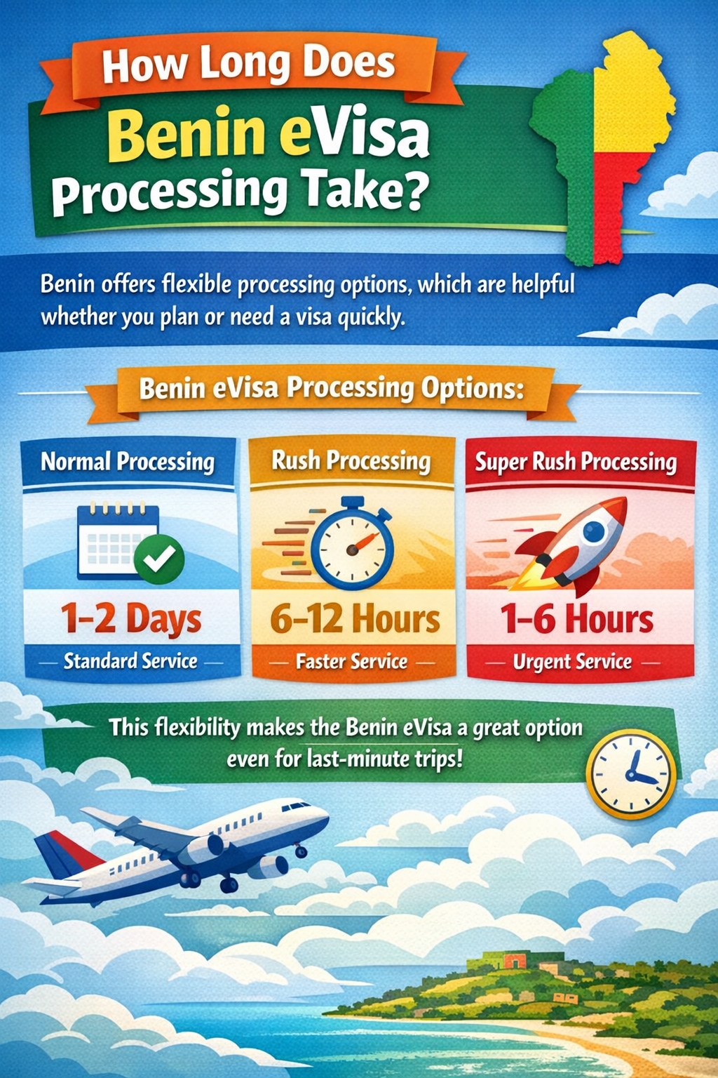 Benin offers flexible processing options, which are helpful whether you plan or need a visa quickly.