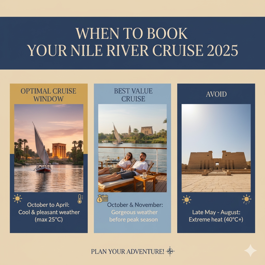 Avoid: Late May through August. Temperatures in Upper Egypt (where the big temples are) hit $40^\circ C+$ daily, making temple excursions almost unbearable.