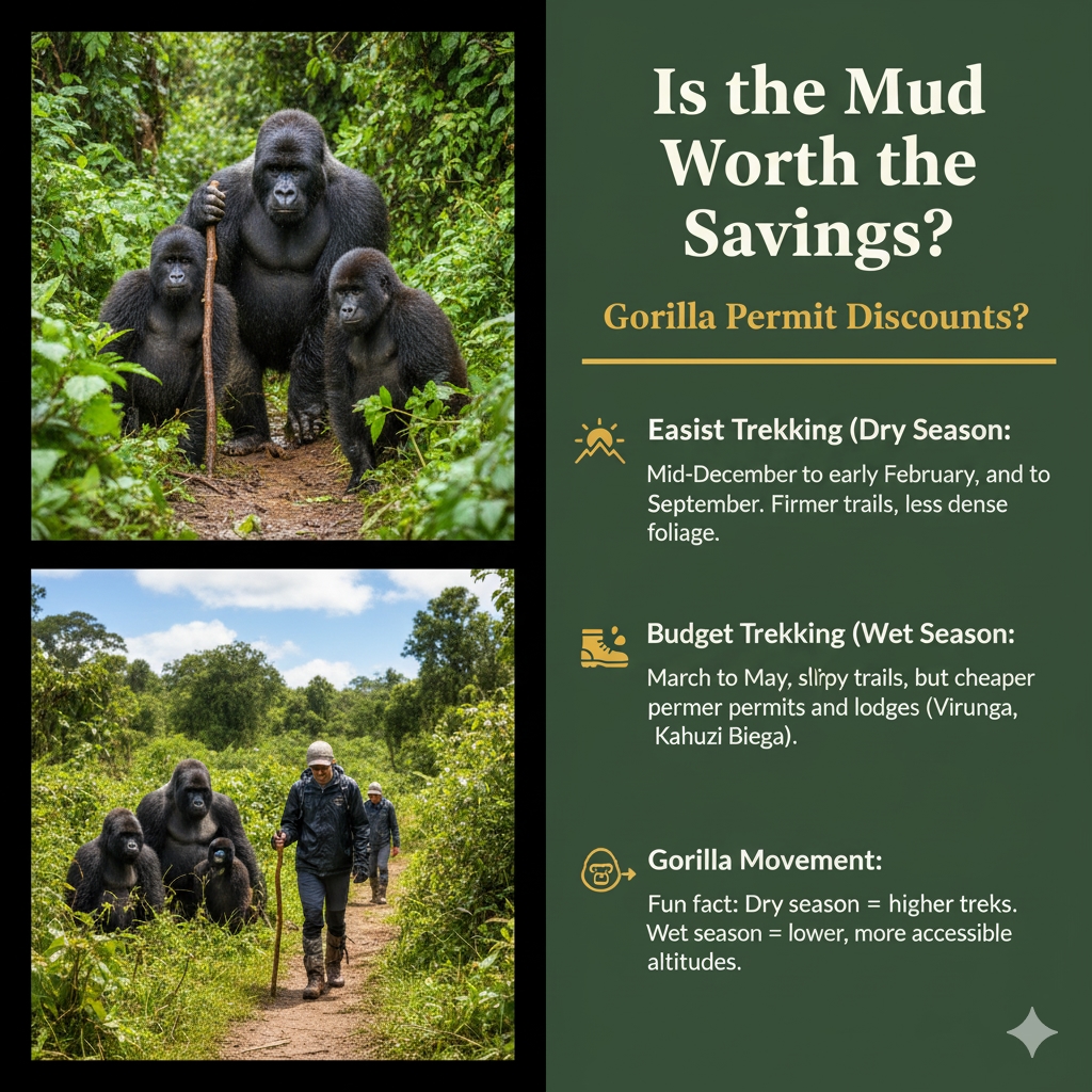 Budget Trekking (Wet Season): March to May, and November. Yes, the trails will be muddier and more slippery, but permits and lodge prices are often significantly cheaper in areas like Virunga and Kahuzi Biega (DRC).