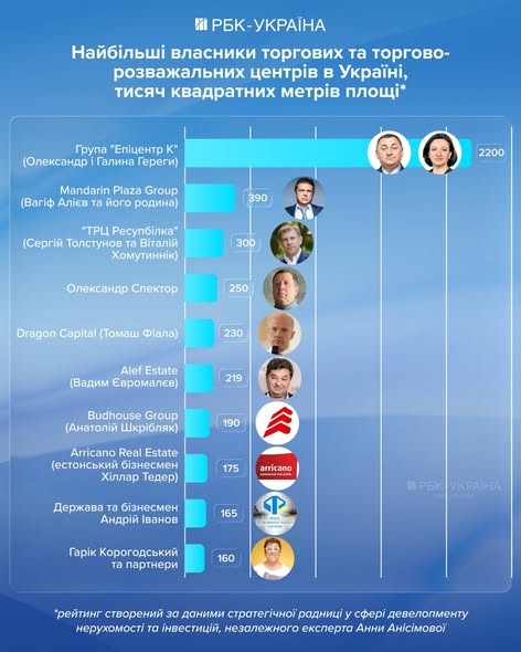 Структура власності на ринку ТРЦ залишається висококонцентрованою. Найбільші площі формує Епіцентр К, який фактично створив власну модель торгового простору, поєднавши ритейл, сервіс і розваги. Водночас сегмент класичних торгових центрів із повноцінною інфраструктурою контролюють девелопери на кшталт Вагіф Алієв, чия група реалізувала ключові об’єкти столичного ринку та продовжує розширювати портфель, включно з масштабними проєктами на перспективу. Інституційні інвестори, такі як Dragon Capital під керівництвом Томаш Фіала, працюють більш гнучко, фокусуючись на купівлі та перепродажі активів із потенціалом зростання вартості. Окремим фактором останніх років стала поява держави як власника великих торгових центрів, зокрема після історії з Gulliver та націоналізації частки Аркадій Ротенберг у Ocean Plaza.
