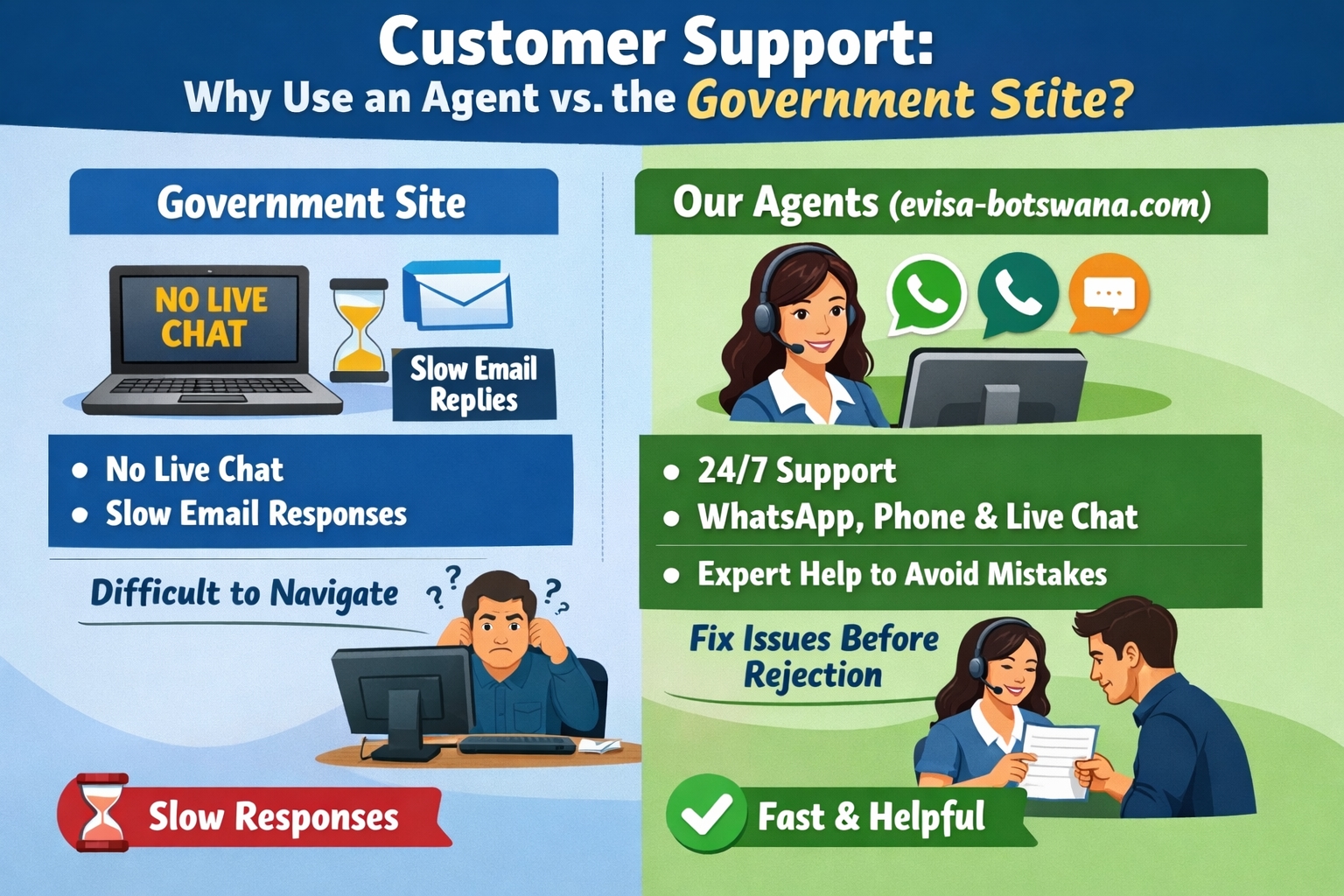 Agent (evisa-botswana.com): We offer 24/7 Support via WhatsApp, Phone, and Live Chat. We provide a human touch, helping you fix errors before they lead to a rejection, which the government portal will not do.
