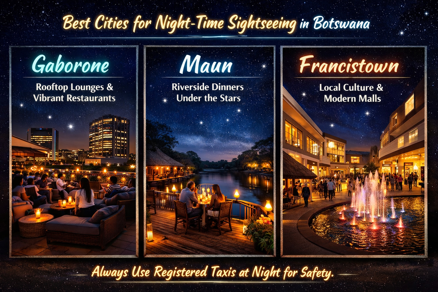 While Botswana is famous for its daytime safaris, some cities offer unique evening vibes: