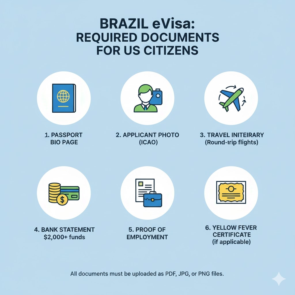 To apply for the tourist eVisa, you will need the following documents Required for Brazil visa ready to upload (as PDF, JPG, or PNG files):