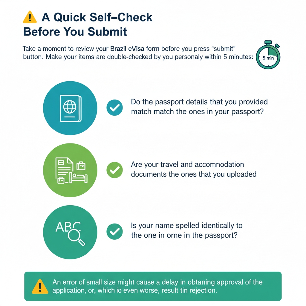 Take a moment to review your Brazil eVisa form before you press the "submit" button. Make sure your items are double-checked by you personally within 5 minutes:
