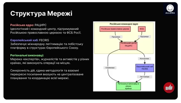 ЦИТАТА з відео Брифінг у Конгресі | «АЛЛАТРА» на Капітолійському пагорбі: протидія когнітивній війні : “1:00 Ми з високим ступенем впевненості 1:02 припускаємо, що ці методи розробляються 1:05 і застосовуються скоординованою 1:07 транснаціональною мережею, що являє 1:10 собою нову форму гібридного тероризму. 1:16 Основні елементи методів її роботи 1:19 безпосередньо запозичені з нацистської 1:22 пропаганди. Мережа також використовує 1:24 розробки кдб в сфері психологічних 1:27 операцій. 1:30 Мережа, вочевидь, керується з єдиного 1:32 центру, яким фактично є російська 1:35 федерація 1:36 і спецслужба під назвою фсб. 1:43 Сучасна версія антикультового руху була 1:46 відроджена на початку 1990-х років, 1:49 цього разу на російській землі, з дуже 1:52 чіткою метою. Мета полягала в тому, щоб 1:55 служити інструментом відродження 1:56 тоталітарного режиму і підриву 1:58 демократичного світу. 2:01 Їхня заявлена місія - боротися з сектами 2:04 і захищати суспільство від культів. Це 2:06 лише їхній зовнішній фасад для публіки. 2:09 Насправді їхня методологія базується на 2:11 інформаційному психологічному 2:12 насильстві. Їхньою основною зброєю є 2:15 стигматизація, дискредитація в очах 2:17 громадськості та систематичне 2:19 розпалювання соціальної ненависті до 2:21 релігійних, соціальних і політичних 2:23 меншин. Мережа антикультистів має 2:26 ієрархічну структуру. На її вершині 2:29 знаходиться ідеологічне ядро, 2:31 розташоване в росії. 2:33 російська асоціація центрів вивчення 2:36 релігій і сект РАЦИРС. Цю організацію 2:40 очолює Олександр Дворкін. РАЦИРС охоплює 2:44 майже всі місіонерські відділи та центри 2:46 російської православної церкви. Тому він 2:49 присутній в кожному місті росії, де є 2:52 російська православна церква 2:54 і діє за підтримки як рпц так і фсб, 2:58 їхньої головної спецслужби.”