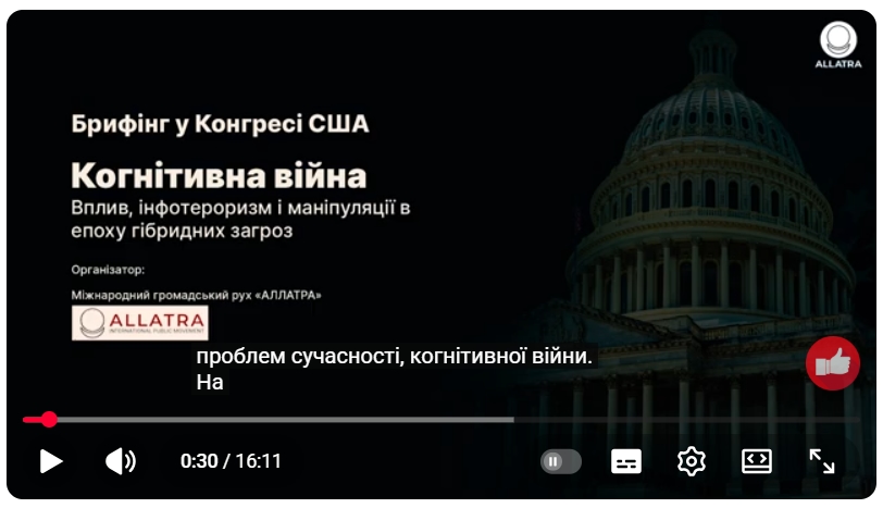 Брифінг у Конгресі, організований Міжнародним громадським рухом «АЛЛАТРА» на Капітолійському пагорбі, виявив загрозу когнітивної війни, елементами якої є вплив, інфотероризм і маніпуляція, як глобального інструменту, що підриває демократію і національну безпеку США.