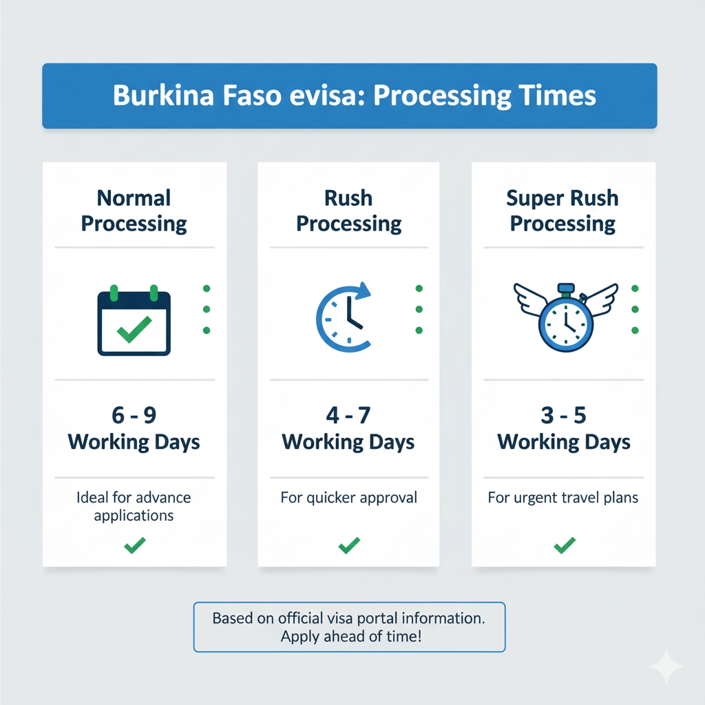 Based on the screenshot, the processing time for Burkina Faso eVisa depends on the selected option: