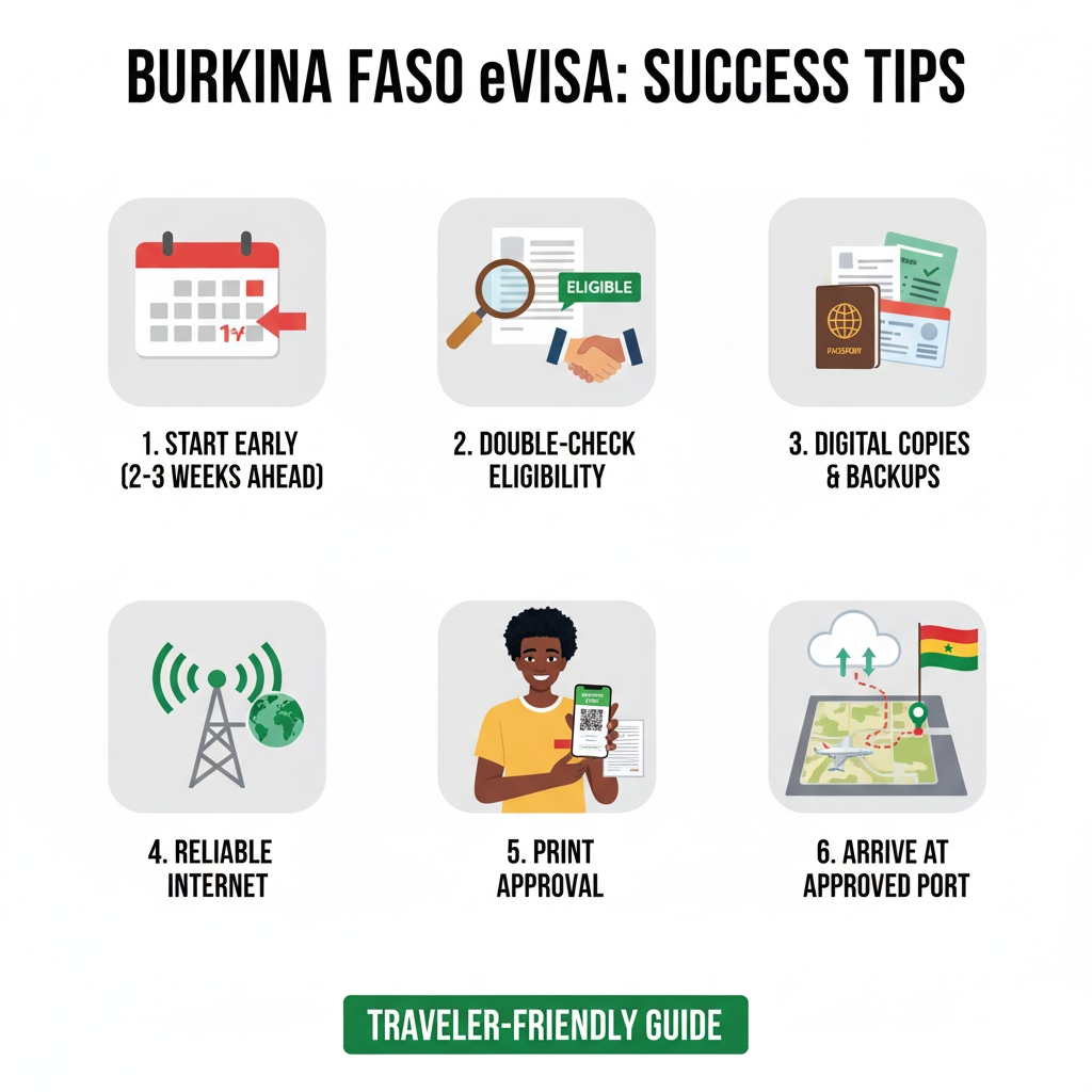 Therefore, for the scenario “Burkina Faso eVisa Online from Guyana,” you may face extra steps: either the general online option may apply if eligibility has been updated, or you may need to make contact with the Burkina Faso diplomatic mission in your region.