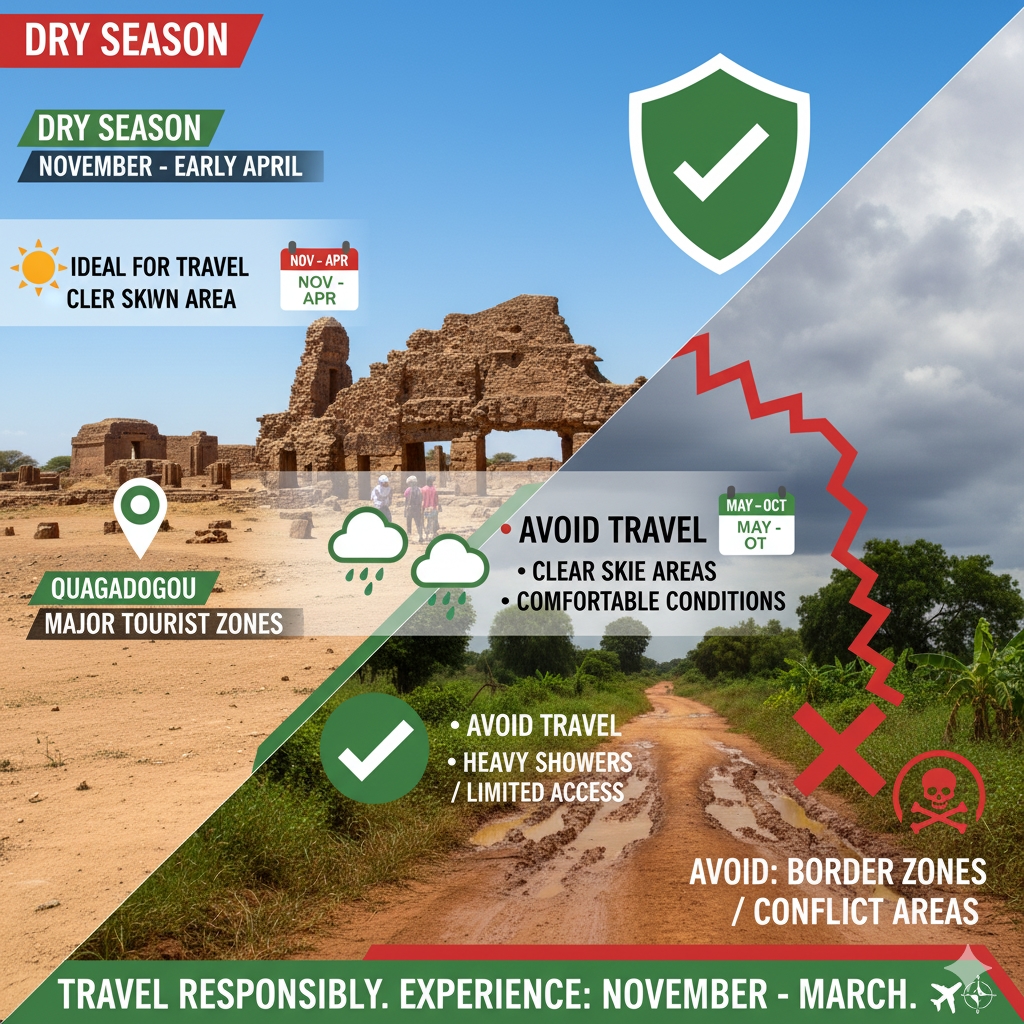 The ideal time to visit Burkina Faso is during the dry season, generally from November to early April. During these months you’ll enjoy clearer skies, less rain, and comfortable conditions for exploring. If you visit during the rainy season (roughly May to October), you might face heavy showers, muddy roads and limited access to some remote areas. Hence, for a smoother travel experience, target travel in the late autumn/winter period (e.g., November-March).