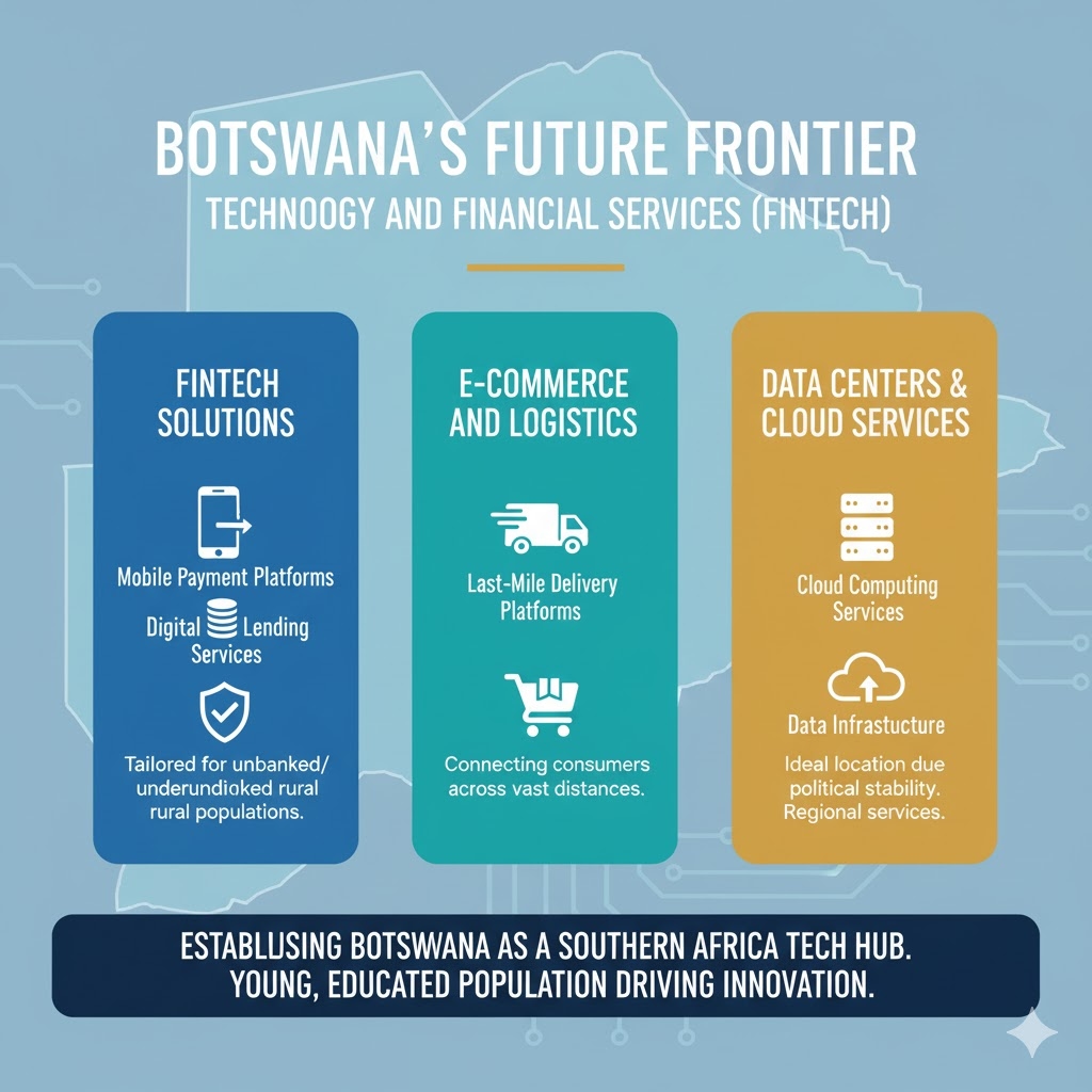 Data Centers and Cloud Services: Due to Botswana's political stability, it is an ideal location to host regional data infrastructure and provide cloud computing services to neighboring countries.