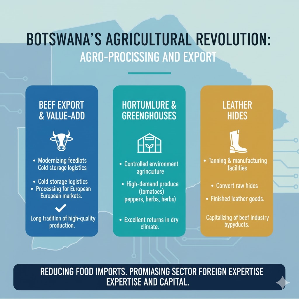 Botswana aims to reduce its dependence on food imports, making agriculture business Botswana one of the most promising sectors for foreign expertise and capital.