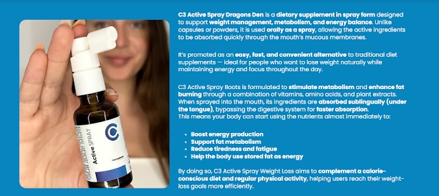 C3 Active Spray UK offers a unique and effective solution for individuals looking to support their weight loss journey. With its fast-acting, convenient, and natural formula, it helps control appetite, boost metabolism, and enhance fat-burning, all while providing a sustained energy boost. Whether you're at home, at work, or on the go, C3 Active Spray makes it easier than ever to maintain your weight loss goals. Its ease of use and portability make it a practical addition to any weight management routine. So, if you’re looking for a fast, effective, and convenient way to support your weight loss journey, C3 Active Spray could be the solution you’ve been waiting for.