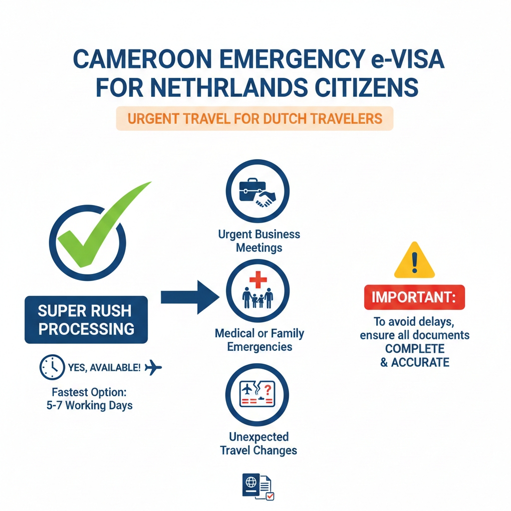 Yes. Dutch travellers who need to visit Cameroon urgently can use the Cameroon Emergency eVisa application under the Super Rush Processing category. This is the fastest option available, usually taking 5–7 working days.
