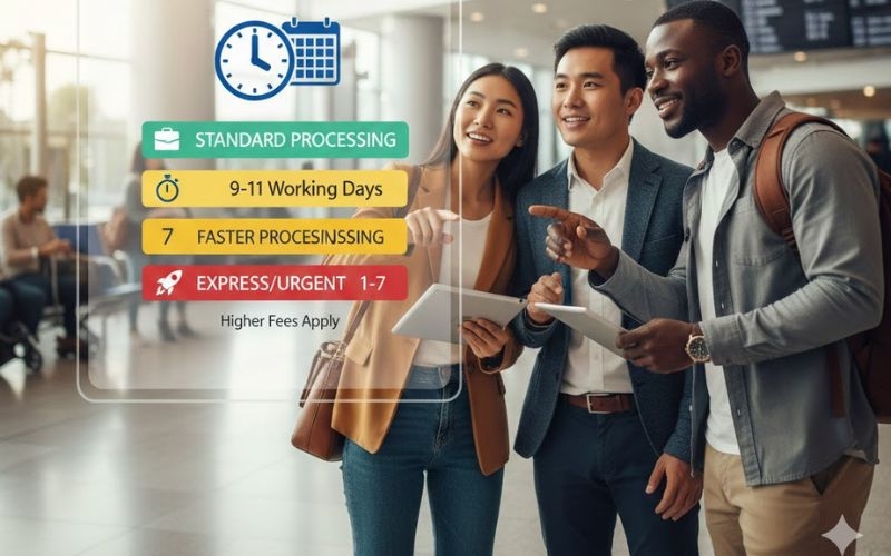 Standard processing often takes about 9–11 working days, though some cases may be processed in around 3 business days after payment. For urgent travel, express processing may shorten the wait.